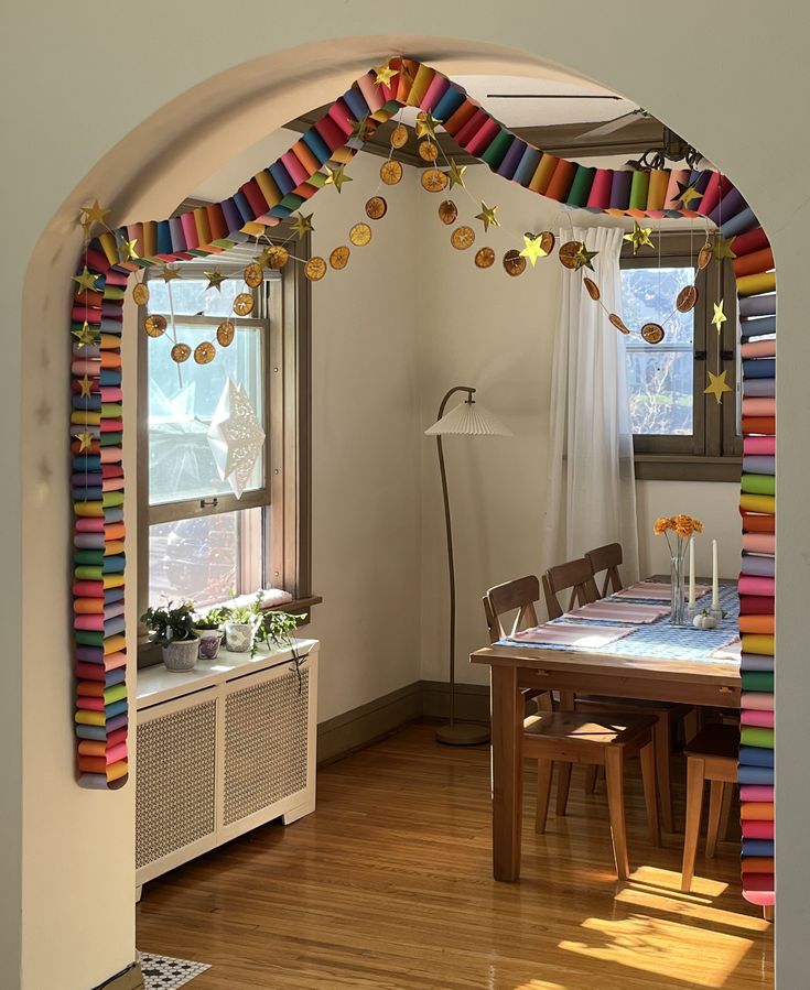 Paper chains in bright colors instantly brighten up a room and look adorable over an archway, tree, mantle, or kids’ play area. They’re nostalgic in the best way and add so much personality, especially with layered textures like gold stars or dried orange slices.